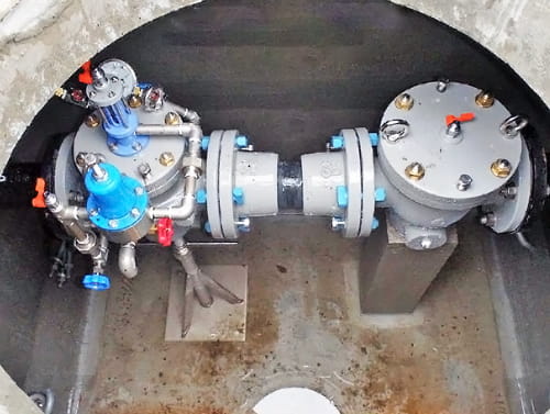 1. 流入管と流出管を緊急遮断する為の2台のバルブと、バイパス管を緊急開放する為の1台のバルブの計3台のバルブで機能をさせます。 2. 配水本管の圧力が設定圧力より低くなると、流入管と流出管の2台のバルブは閉止します。バイパス管のバルブは開放し本管の流路を確保します。配水本管の圧力が設定圧力より高くなると自動復帰します。 3. 現場の実績を踏まえて、メンテナンス性(維持管理)を考慮した設計を取り入れています。 |